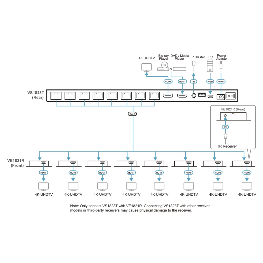 VS1828Kit este un set care conține 1 distribuitor și 8 receptoare și împarte o sursă HDMI printr -un singur cablu Cat 6 în până la 4K @ 30 Hz (4: 4: 4) până la 8 afișaje, până la 40 de metri distanță. Sistemul acceptă, de asemenea, formate audio digitale fără pierderi, cum ar fi LPCM 7.1ch, Dolby Truhd, Dolby Digital Plus și DTS-HD Master Audio. Distribuitorul necesită un singur adaptor de rețea, deoarece receptoarele sunt hrănite de către distribuitor datorită funcției de power over cabl (POC), care ajută la evitarea cablului. Distribuția are un port de ieșire local HDMI pentru monitorizarea conținutului sau în scopuri în cascadă. În plus, distribuitorul conține un comutator EDID ajustat de utilizator care permite utilizatorilor să configureze dezintegrații video de ieșire și capabilități audio pentru a integra fără probleme sistemul. Dimensiunea ultra -ușoară, de palmier a receptorului, oferă o instalare flexibilă, inclusiv echipamente și plasare în zone înguste.