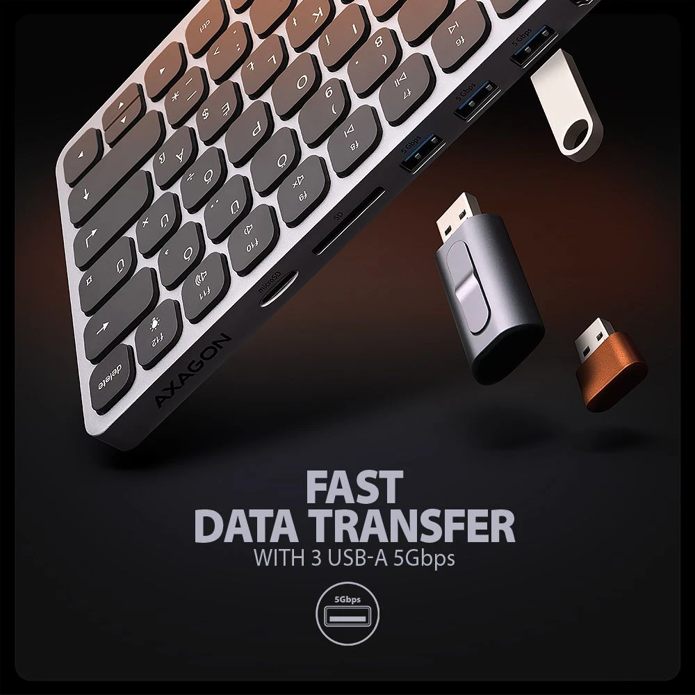 Hub-ul AXAGON HMC-KB KEYBOARD transformă telefonul, tableta sau mini-laptop-ul într-o stație de lucru completă pentru computer. Conectați-vă dispozitivul mobil la stația de andocare 9 în 1 prin cablul de 60 cm lungime inclus. În cel mai scurt timp, are o tastatură integrată, un cititor de carduri SD și microSD și conectori pentru conectarea unui monitor extern, trei dispozitive USB, căști sau căști și putere Power Delivery. Cu toate acestea, este esențial ca portul USB-C al dispozitivului mobil să accepte ieșirea video (DisplayPort Alternate Mode) și Power Delivery.