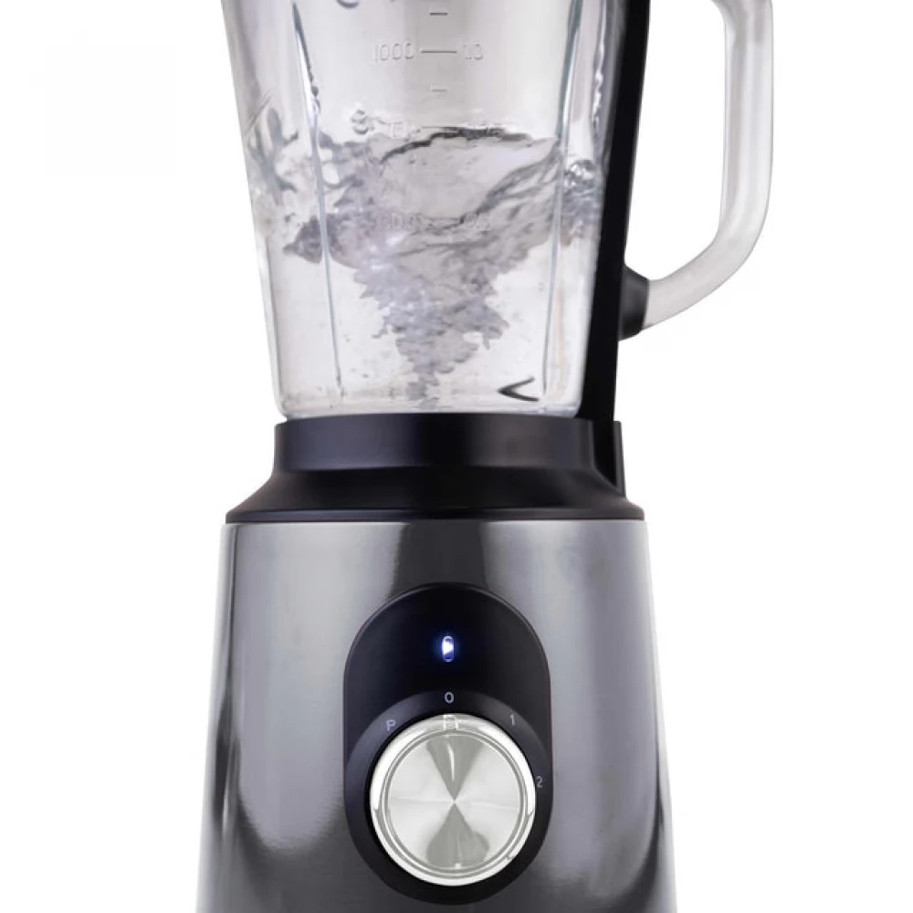 Blenderul cu recipient standard din sticlă securizată de 1,5 L (1000 W) face parte din Metallic Line Carbon Edition, care este un instrument esențial pentru bucătăriile moderne. Acest blender impresionează nu numai prin funcționalitate, ci și prin stil. Culoarea gri închis și designul curat vă garantează că îl puteți afișa cu mândrie pe blatul din bucătărie, nu trebuie să îl ascundeți adânc într-un sertar.