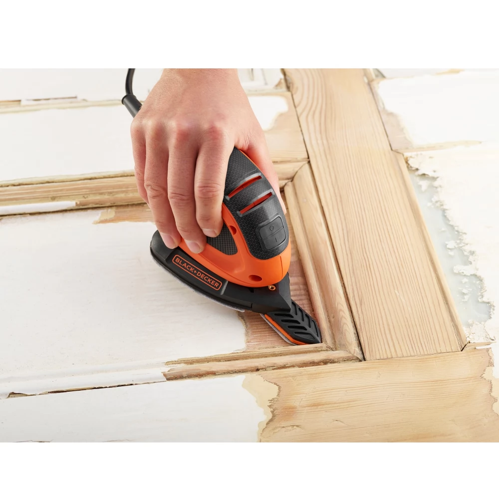 Inspirat de mouse-ul computerului, șlefuitorul BLACK + DECKER este un ajutor indispensabil din 1998. Designul deosebit de ușor și ergonomic al noului compact BEW230 permite prelucrarea diferitelor suprafețe, de la colțuri la margini. Oferă o gamă largă de aplicații, nu numai pentru șlefuire, ci și pentru lustruire, curățare sau îndepărtarea ruginii. Compactul BEW230 se potrivește perfect în mână și este ideal pentru șlefuirea zonelor unghiulare și îndepărtarea vopselei și a lacului. Comutatorul rezistent la praf și vârful de șlefuit înlocuibil asigură o durată de viață mai lungă a sculei. Datorită suportului pentru șmirghel Klettfix, șmirghelul poate fi schimbat rapid și ușor.