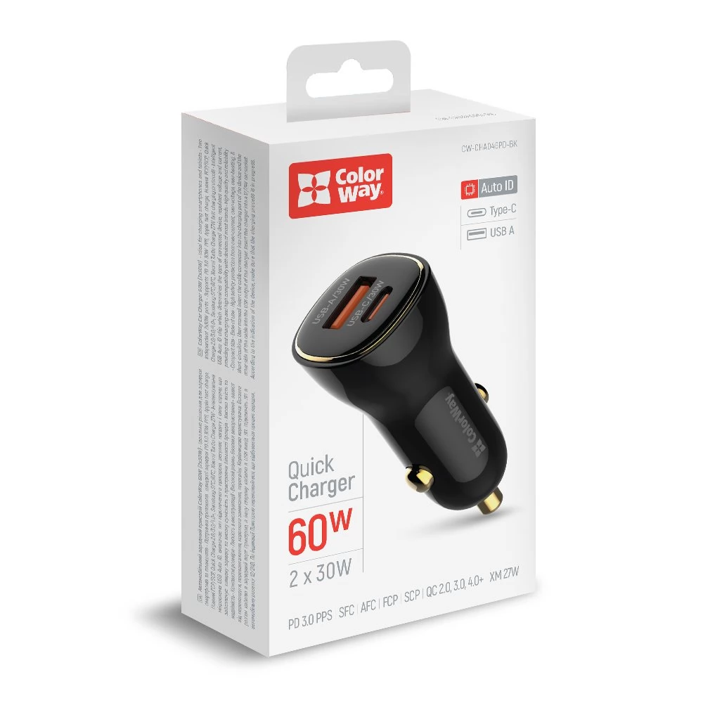 COLORWAY Quick Charge Mașină încărcător 1xUSB 1xUSB-C 60W negru