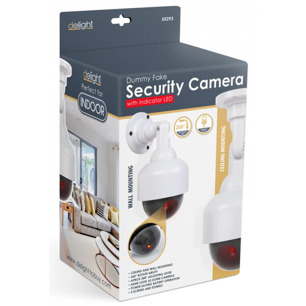 Când este pornit, LED-ul roșu intermitent oferă impresia perfectă a funcționării unui sistem video încorporat. Carcasa profesionala ofera camerei „dome” un aspect realist, oferind iluzia completa de securitate. Functionarea este asigurata de 2 baterii AA, care nu sunt incluse. Poate fi instalat cu ușurință folosind diblurile și șuruburile de montare incluse în pachet și nu necesită cablare. Nu poate fi conectat la un sistem video!