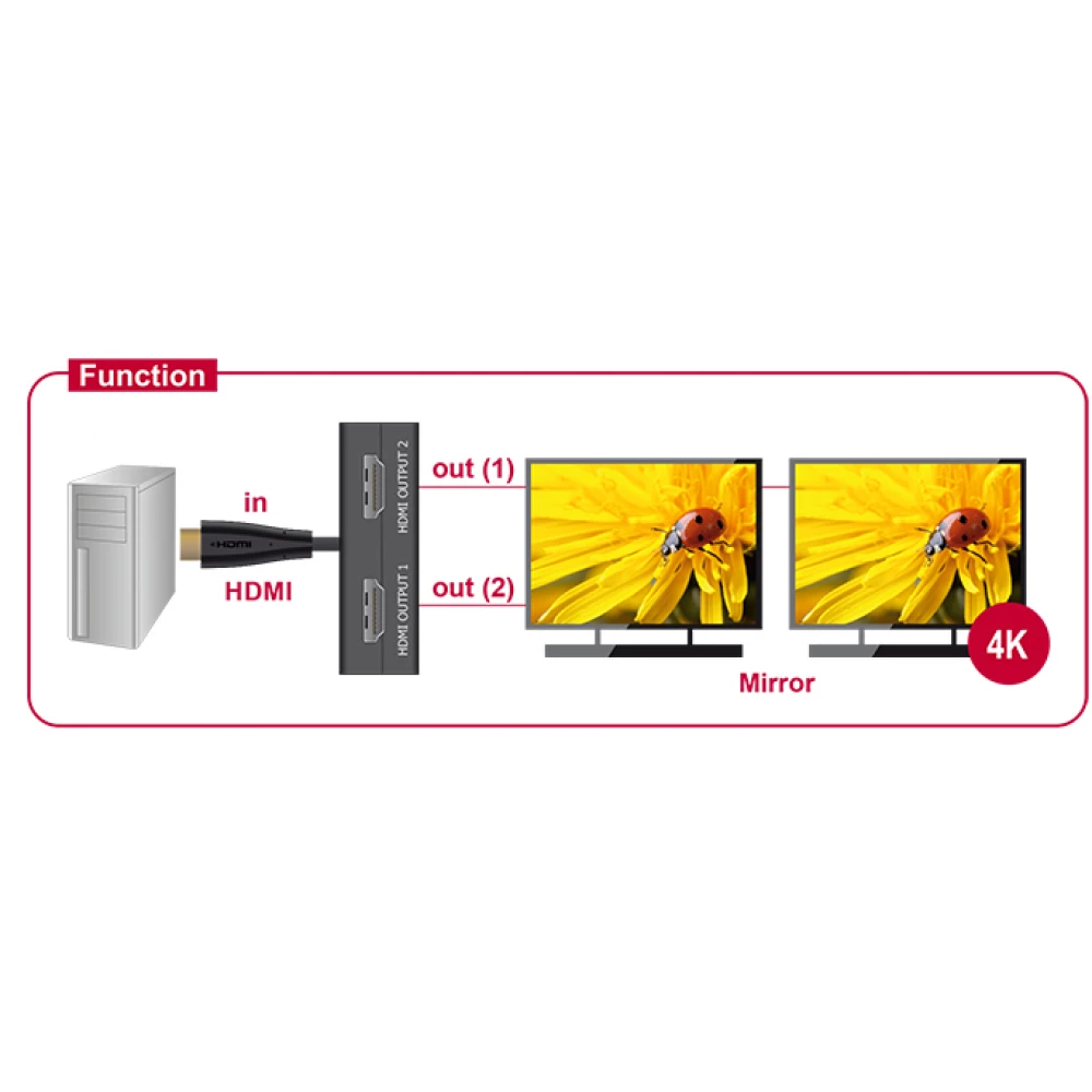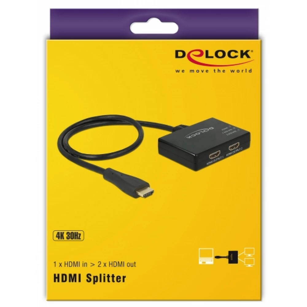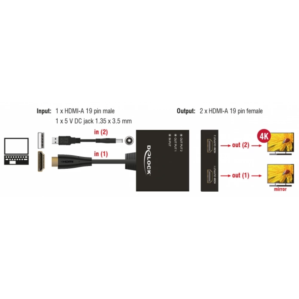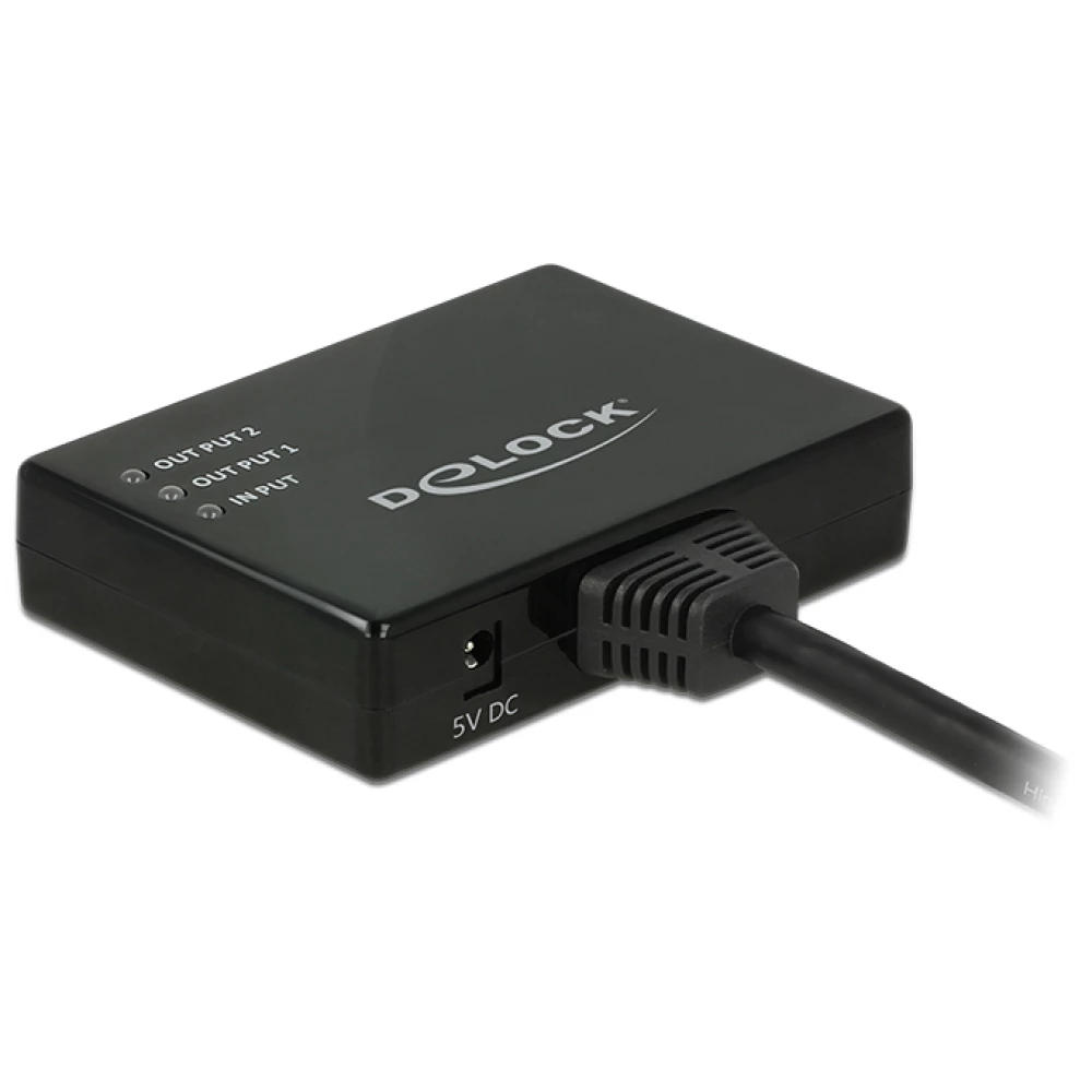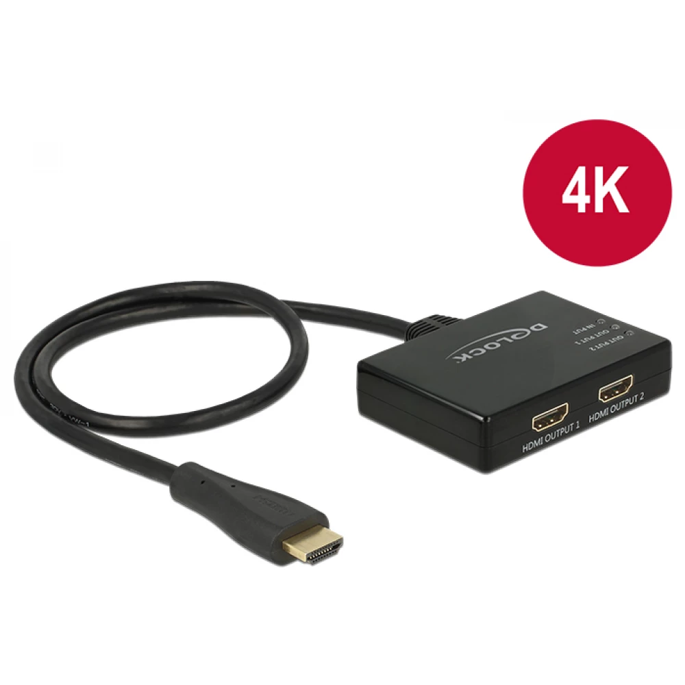 Acest splitter de la Delock primește un semnal HDMI de la un computer desktop sau laptop și distribuie semnalul la două afișaje conectate. Datorită acestui fapt, două monitoare HDMI pot fi operate cu un conector HDMI.