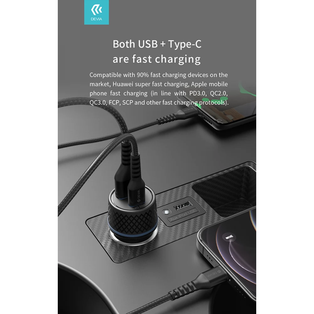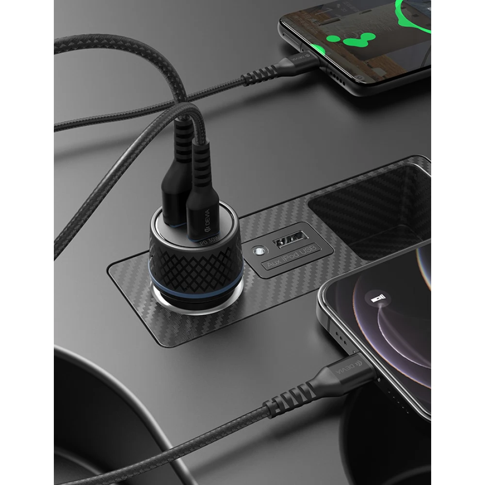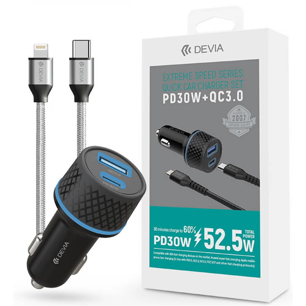 DEVIA Mașină extrem încărcător rapid 1xUSB+ USB-C 52.5W + lightning cablu negru
