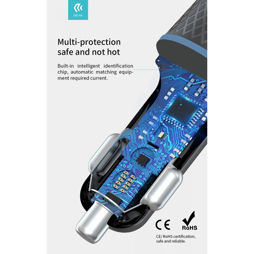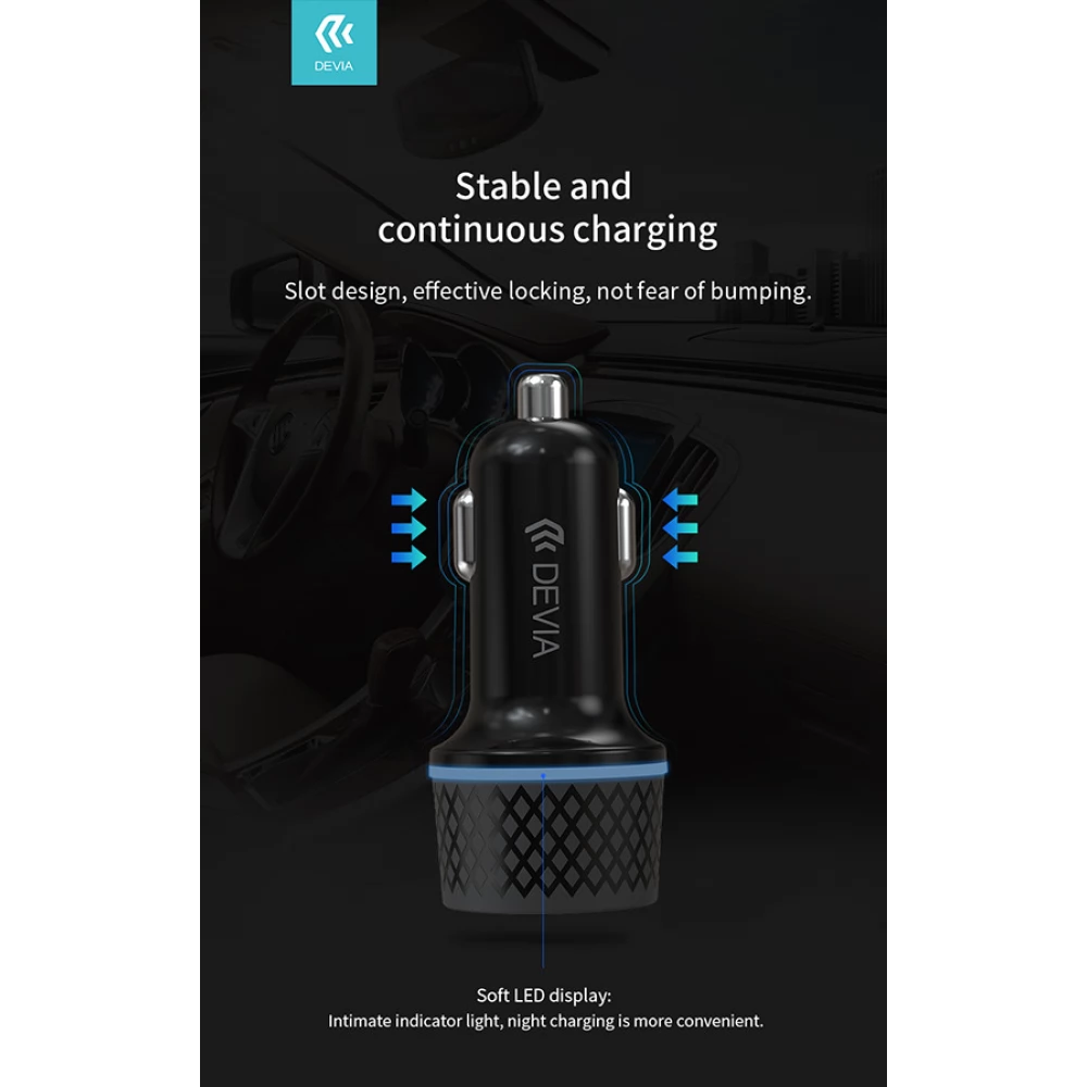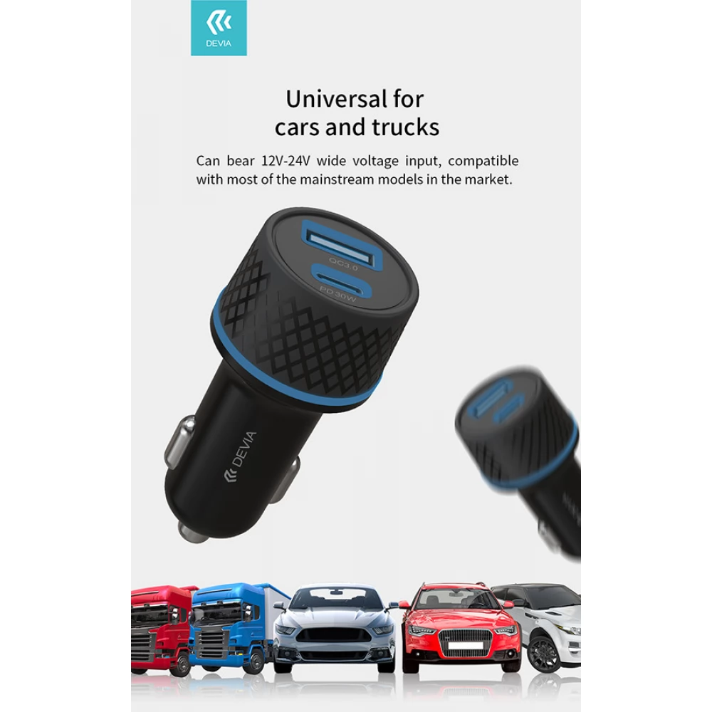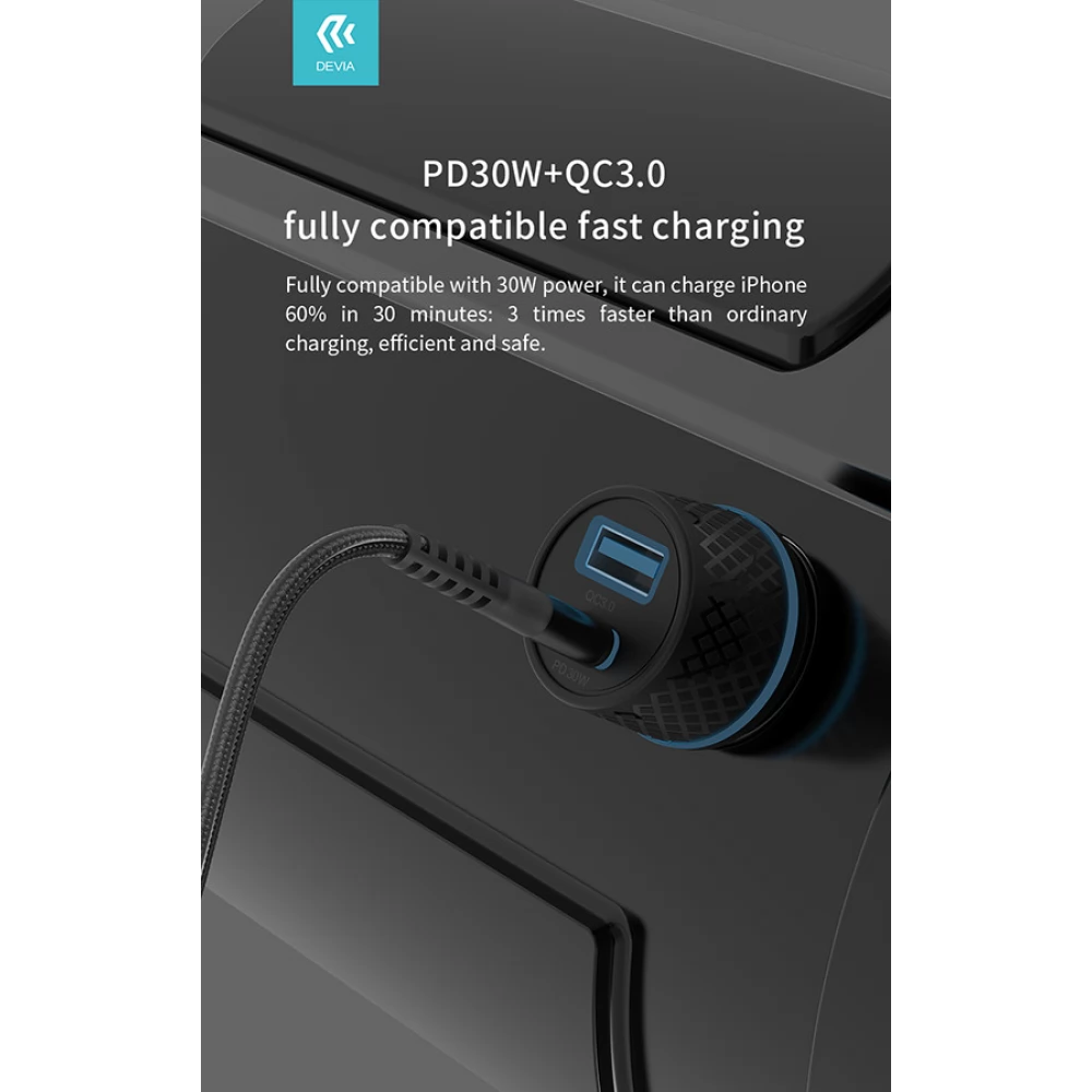 DEVIA Mașină extrem încărcător rapid 1xUSB+ USB-C 52.5W + lightning cablu negru