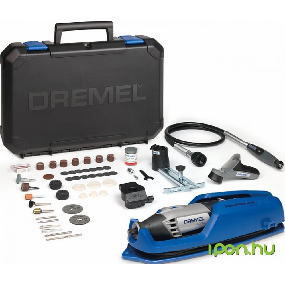 Acest kit Dremel include instrumentul multiplu de înaltă performanță 4000 cu noul capac EZ Twist. Aceasta înseamnă că nu veți mai avea nevoie de o cheie la schimbarea accesoriilor. Toate acestea le primești într-o cutie de depozitare ordonată, care include, de asemenea, o tavă pentru accesorii extrasă și un suport pentru unelte montat pe perete, care oferă posibilitatea de a înfășura cu ușurință cablul uneltei. În această husă practică de transport găsiți și arborele flexibil, freza dreaptă și rotundă, mânerul pentru detaliere și platforma de formare. Pe lângă acestea, mai primești și alte 65 de accesorii originale Dremel.