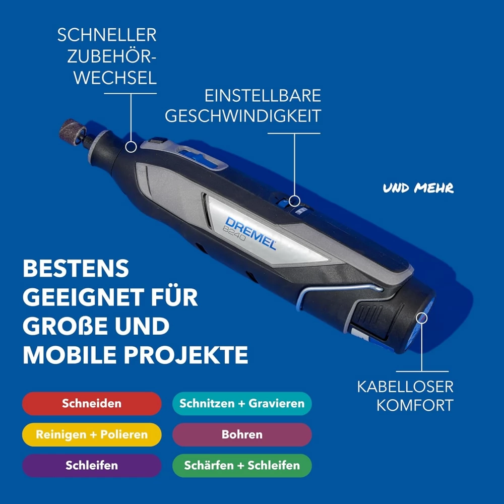 Performanță excelentă cu instrumentul fără fir Dremel 8240. Ține totul sub control cu această centrală portabilă. Putere echivalentă cu o unealtă Dremel 4250 cu fir - fără a fi legat de o sursă de alimentare. Mic, dar puternic - timp de funcționare lung datorită bateriei puternice și detașabile de 2 Ah.