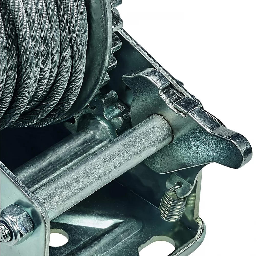 Capacitatea maximă de încărcare a troliului manual Einhell TC-WI 800 este de 800 de kilograme. Ambalajul din fabrică include, de asemenea, cablul de sârmă de 20 de metri lungime, fără răsuciri (Ø 4,8 mm) și cârligul echipat cu o carabină de siguranță. Carabiniera de siguranță împiedică sarcina asigurată să alunece de pe cârlig. Cu ajutorul mecanismului cu clichet, puteți opri în siguranță frânghia și sarcina. Manivela este acoperită cu Softgrip, care garantează o prindere puternică și un lucru confortabil. Puteți fixa cu ușurință troliul folosind găurile de pe placă.