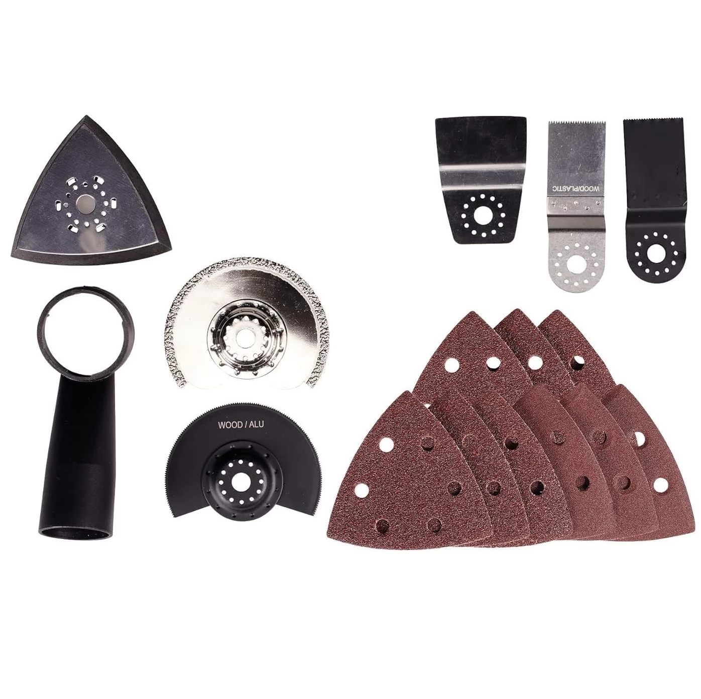 Instrumentul multifuncțional TE-MG 350 EQ este un dispozitiv practic și versatil care satisface pe deplin cele mai înalte așteptări ale bricolatorilor. Puteți folosi unealta multifuncțională pentru tăierea și șlefuirea lemnului, plasticului și metalului. De fapt! Cu ajutorul lui, puteți îndepărta cu ușurință și rosturile plăcilor! Datorită motorului de 350 de wați, dispozitivul va avea întotdeauna suficientă putere pentru a efectua lucrări cu performanță intensivă. Sistemul electronic de control al vitezei vă asigură că puteți regla întotdeauna viteza la proprietățile materialului de prelucrat. Electronica constantă ajută la menținerea performanței în toate situațiile. Accesoriul cu eliberare rapidă poate fi schimbat fără unelte, iar suportul magnetic pentru scule, care poate fi reglat la 12 niveluri diferite, permite schimbarea simplă a sculei și atașarea optimă a accesoriilor. Iluminarea LED integrată asigură o iluminare optimă a zonei de lucru. Butonul de comutare blocabil asigură lucrul confortabil. Cu un unghi de deviere de 3°. Aparatul cu design subțire și husă Softgrip, cu suprafețe ergonomice, este extrem de confortabil și sigur de utilizat. Nu veți avea nevoie de unelte speciale pentru a instala dispozitivul de extracție a prafului inclus. Pachetul din fabrică include o carcasă (Promo E-Box S35), o lamă de ferăstrău pentru lemn și plastic, o lamă de ferăstrău BIM pentru metal, o lamă de ferăstrău segmentată pentru lemn, plastic și metal ușor (HSS) și un diamant. pânză de ferăstrău segmentată acoperită pentru îmbinări. Ambalajul din fabrică include, de asemenea, o placă de șlefuit triunghiulară, nouă plăcuțe de șlefuit (3-3x P60/P80/P120) și o unealtă de răzuit.