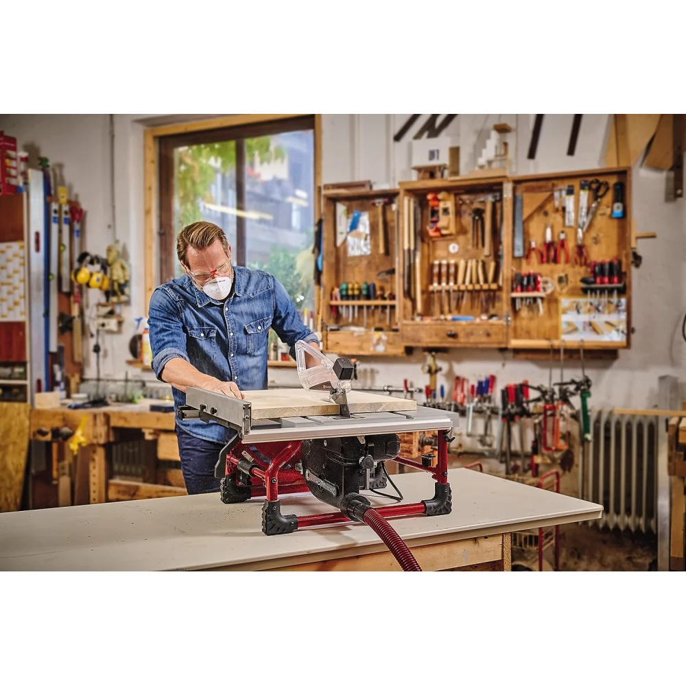 Fierăstrăul circular de masă Einhell TE-TS 254 T nu trebuie să lipsească din încăperea de scule a oricărui om de mână! Cu ajutorul acestuia, puteți face tăieturi rapide și curate, indiferent dacă lucrați cu dispozitivul în casă, atelier sau garaj. Indiferent dacă trebuie să tăiați foi sau panouri de placaj la dimensiune, fie că trebuie să tăiați grinzi și scânduri: datorită pânzei de ferăstrău care poate fi înclinată până la 45° și reglajului continuu pe înălțime, puteți face față cu ușurință sarcinilor și provocărilor ( inaltime maxima de taiere la 45°: 63 mm/ inaltime maxima de taiere la 90°: 89 mm). Pornirea soft protejează motorul. Puteți efectua tăieturi ușor, rapid și precis pe suprafața netedă și pe masa din aluminiu de înaltă calitate. Lățimea mesei ușor de reglat poate fi reglată la max. Proiectat pentru piese de prelucrat de 660 mm. Puteți fixa opritorul paralel folosind clema excentrică. Pentru a asigura tăieturi oblice simple, dispozitivul este echipat cu un opritor de unghi (+/- 60°). Folosind conectorul de extragere a așchiilor (Ø36 mm), zona de lucru va fi întotdeauna curată și ordonată. Pana de separare încorporată poate fi pliată fără unelte, așa că datorită acestui lucru, precum și a designului compact și a mânerelor încorporate, ferăstrăul este extrem de ușor de transportat. Accesoriile și suportul pentru cablu de pe carcasa dispozitivului vă permit întotdeauna să depozitați accesoriile într-un mod ordonat.