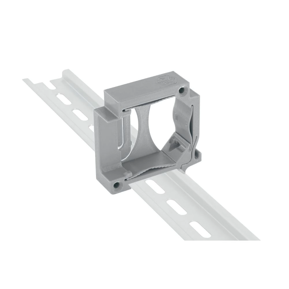 Suportul este ideal pentru montare pe o șină DIN (35 mm), dar poate fi montat și pe un perete sau pe altă suprafață plană folosind cele două orificii de montare. Fabricat în Germania, este fabricat din material PETG rezistent la foc folosind procesul FDM.