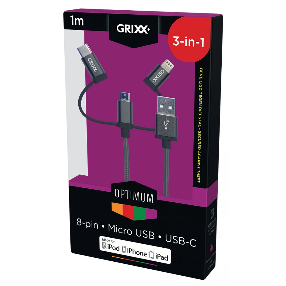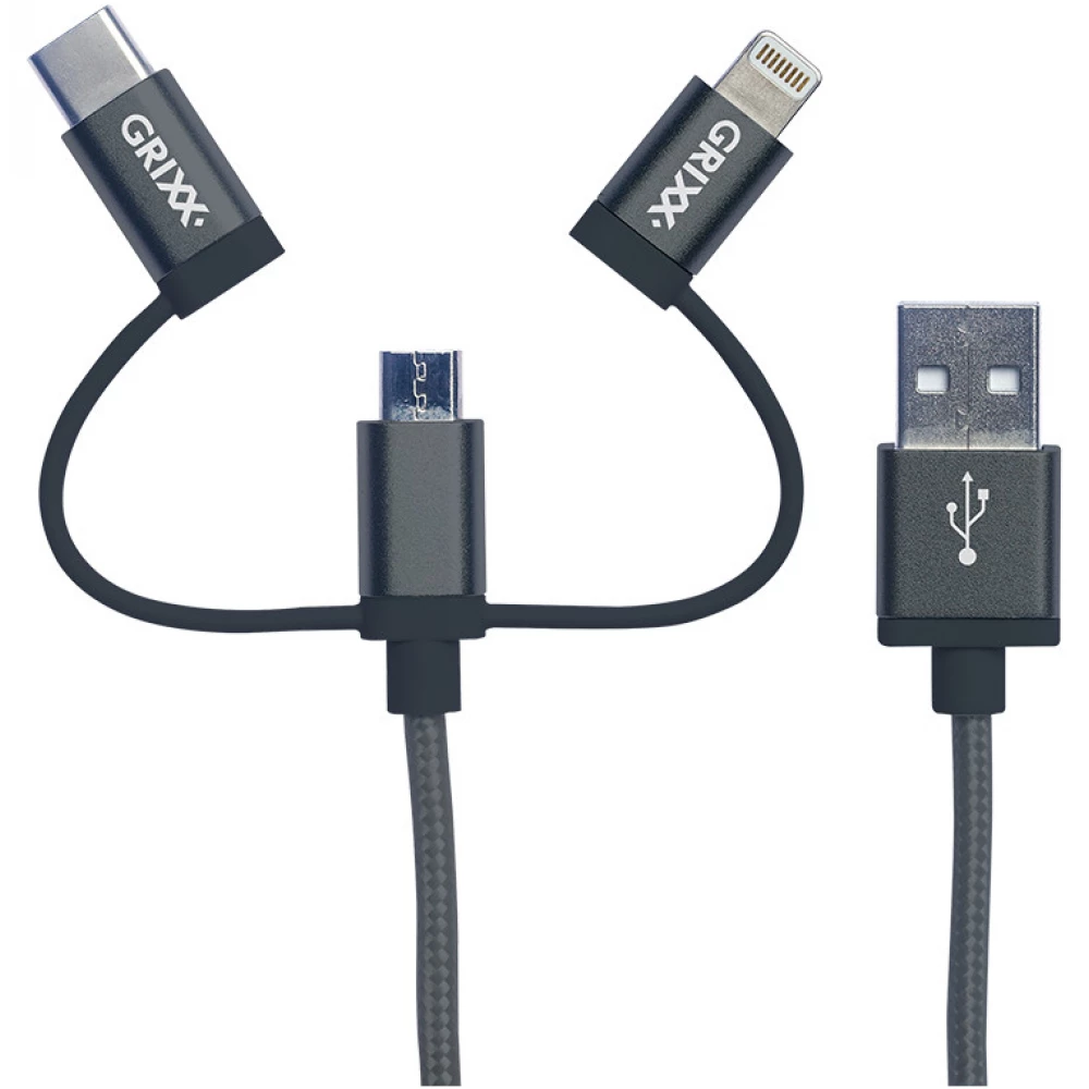 GRIXX USB Lightning + Micro USB + USB Type C Încărcător/cablu date Negru 1m GROCA3IN1FG01