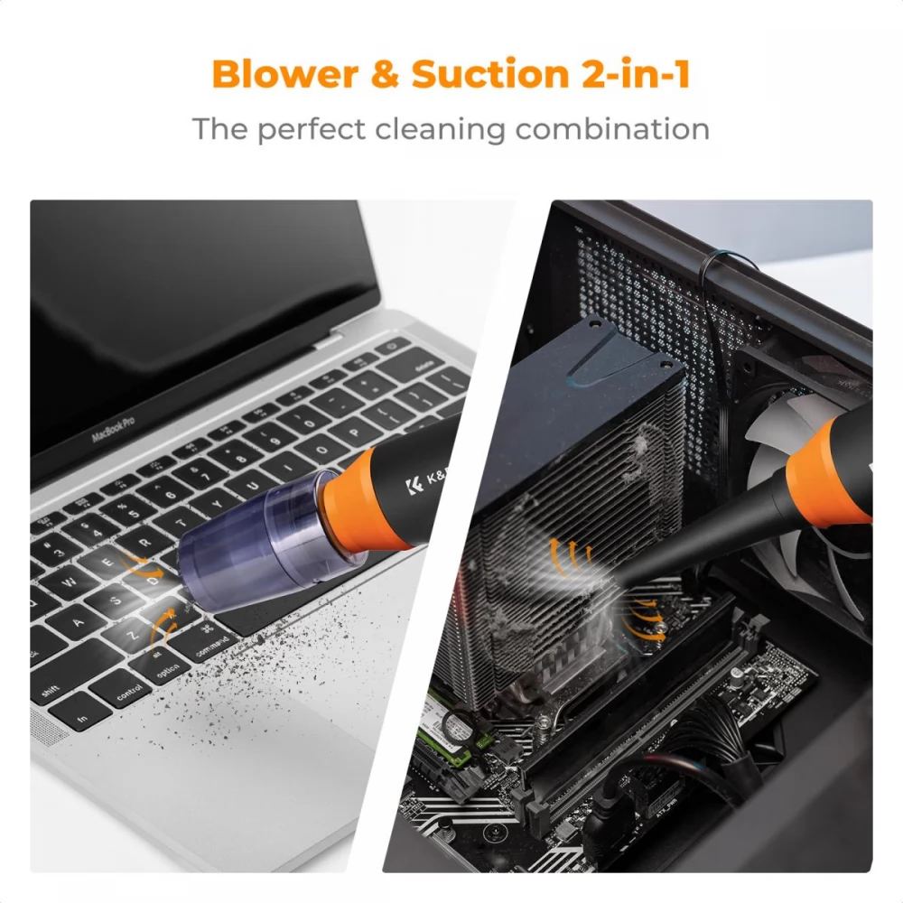 Suflantul și aspiratorul electric K&F Concept 14 în 1 este un instrument de curățare versatil și puternic, conceput pentru a înlocui sticlele de aer comprimat de unică folosință, oferind în același timp o alternativă convenabilă, reîncărcabilă și ecologică.