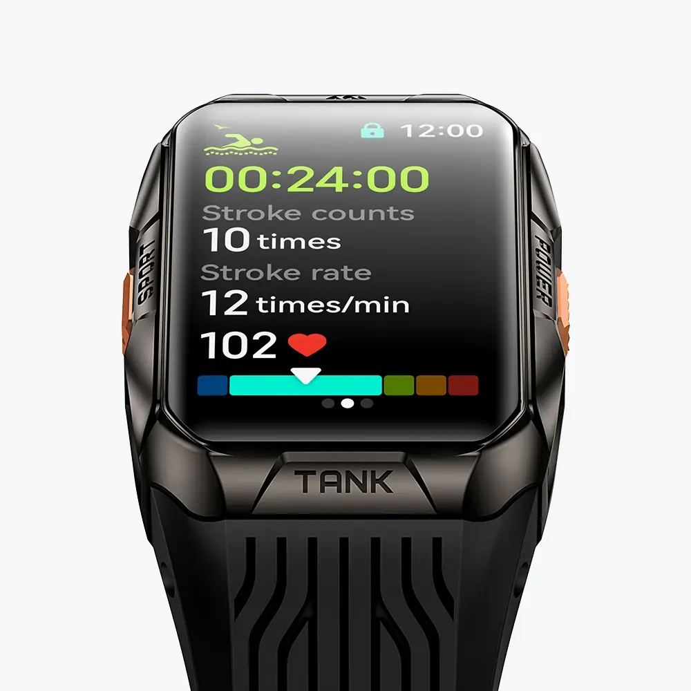 Daca iti place sa inoti, vei aprecia statisticile avansate ale smartwatch-ului KOSPET TANK X2 Ultra. Nu numai că urmărește timpul în apă, dar urmărește și scorul tău SWOLF (suma timpului petrecut într-o lungime a piscinei și numărul de lovituri efectuate pentru acea lungime). De asemenea, recunoaște stilul de înot, loviturile pe minut, ritmul mediu și ritmul cardiac.