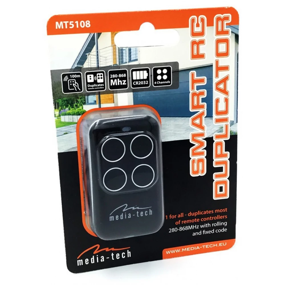 Duplicatorul Smart RC MT5108 este o telecomandă universală cu auto-duplicare - potrivită pentru toată lumea - dublează majoritatea telecomenzilor între 280 MHz și 868 MHz cu coduri variabile și fixe.