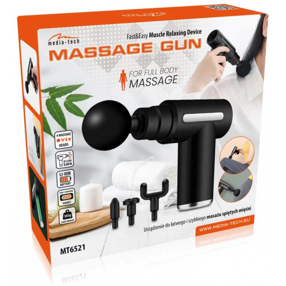 Pistolul de masaj MASSAGE GUN MT6521 este un instrument pentru masaj relaxant și sigur al mușchilor încordați. Setul include 4 capete de masaj interschimbabile: bilă flexibilă, ax, ax dublu și vârf plat.