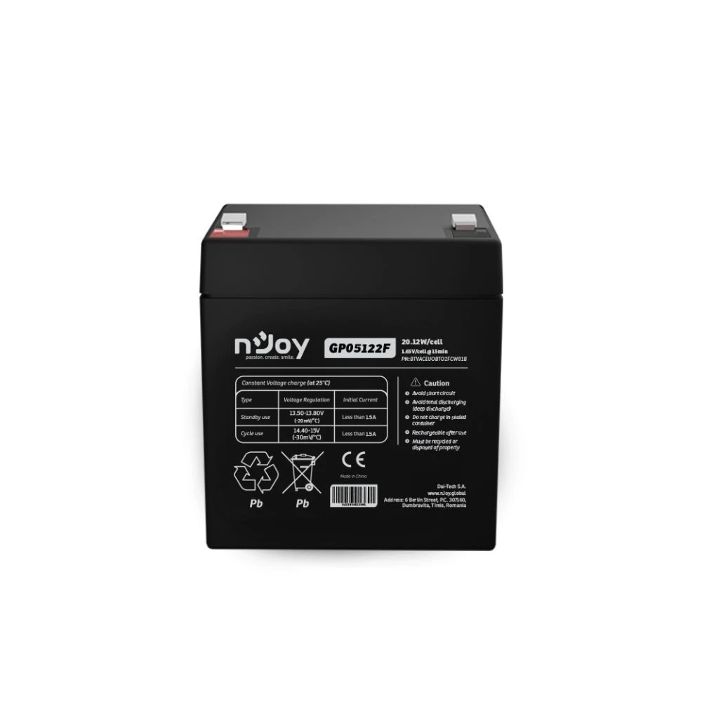 NJOY GP05122F este o baterie fiabilă de 12V/5Ah, neîntreruptibilă, realizată cu tehnologia VRLA AGM (închis fără întreținere). Bateria cu conector T2/F2 este concepută pentru o durată de viață de maxim 5 ani, asigurând astfel funcționarea neîntreruptă a dispozitivelor pe termen lung.