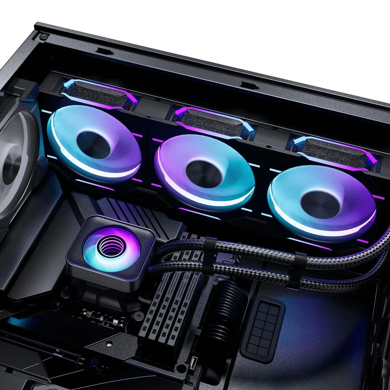 Răcire compactă, universală de apă, cu 3 iluminare argb controlabilă de 120 mm (cadru și lopată) și ventilator cu viteză PWM, radiator de 360 mm și bloc de răcire unic al CPU cu o lumină oglindă infinită. Ventilatorul blocului de frigider ajută, de asemenea, la răcirea plăcii de bază (VRM / M.2 SSD).