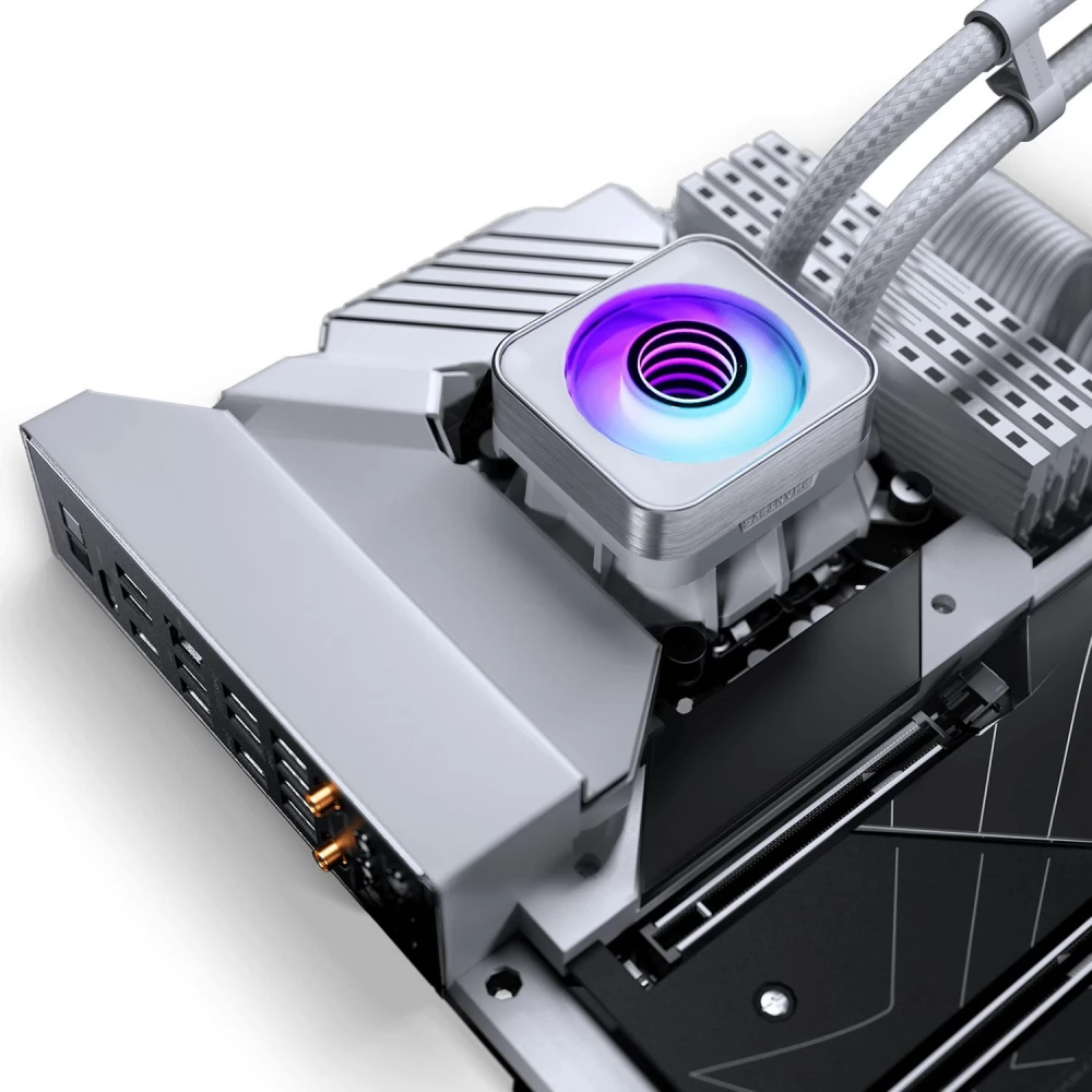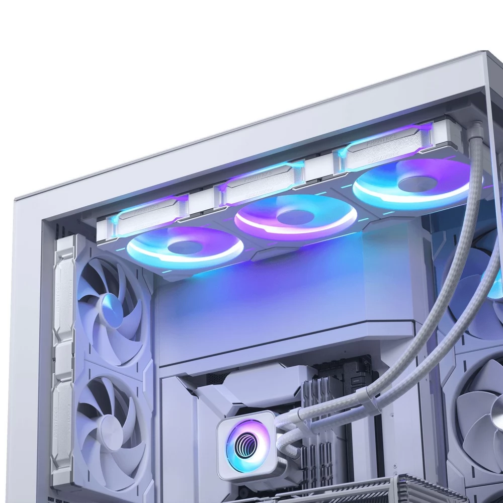 Răcire compactă și universală cu apă cu 3 iluminare Argb controlabilă de 140 mm (cadru și lopată) și ventilator cu viteză PWM, radiator de 420 mm și un bloc unic de răcire a apei CPU, care are, de asemenea, un ventilator luminat Argb controlat, cu o lumină de oglindă nesfârșită. Ventilatorul blocului de frigider ajută, de asemenea, la răcirea plăcii de bază (VRM / M.2 SSD).
