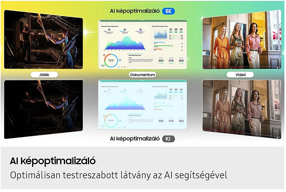 Experimentați o calitate optimă a imaginii, adaptată nevoilor dvs.! Optimizatorul de imagine AI ajustează afișarea imaginii astfel încât să puteți lucra confortabil la documente, să vă scufundați pe deplin în jocuri bogate în nuanțe de negru intens și să vizionați videoclipuri în culori vii.