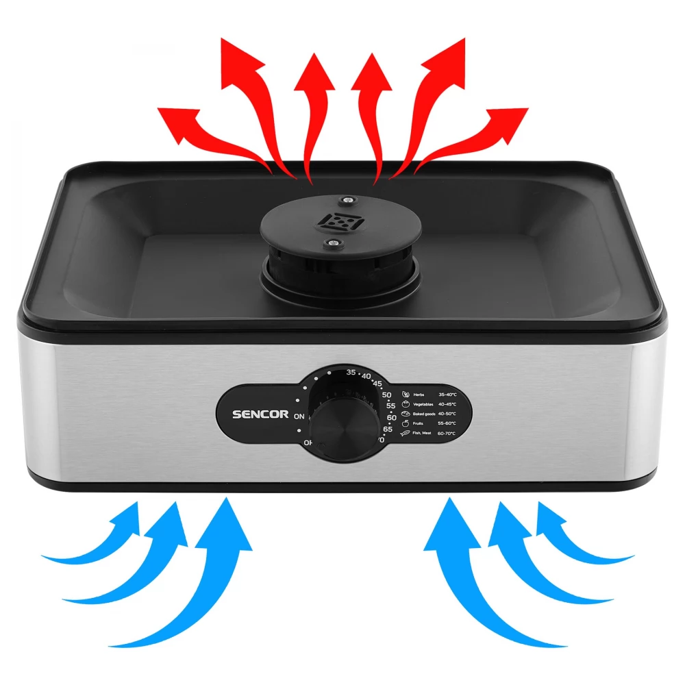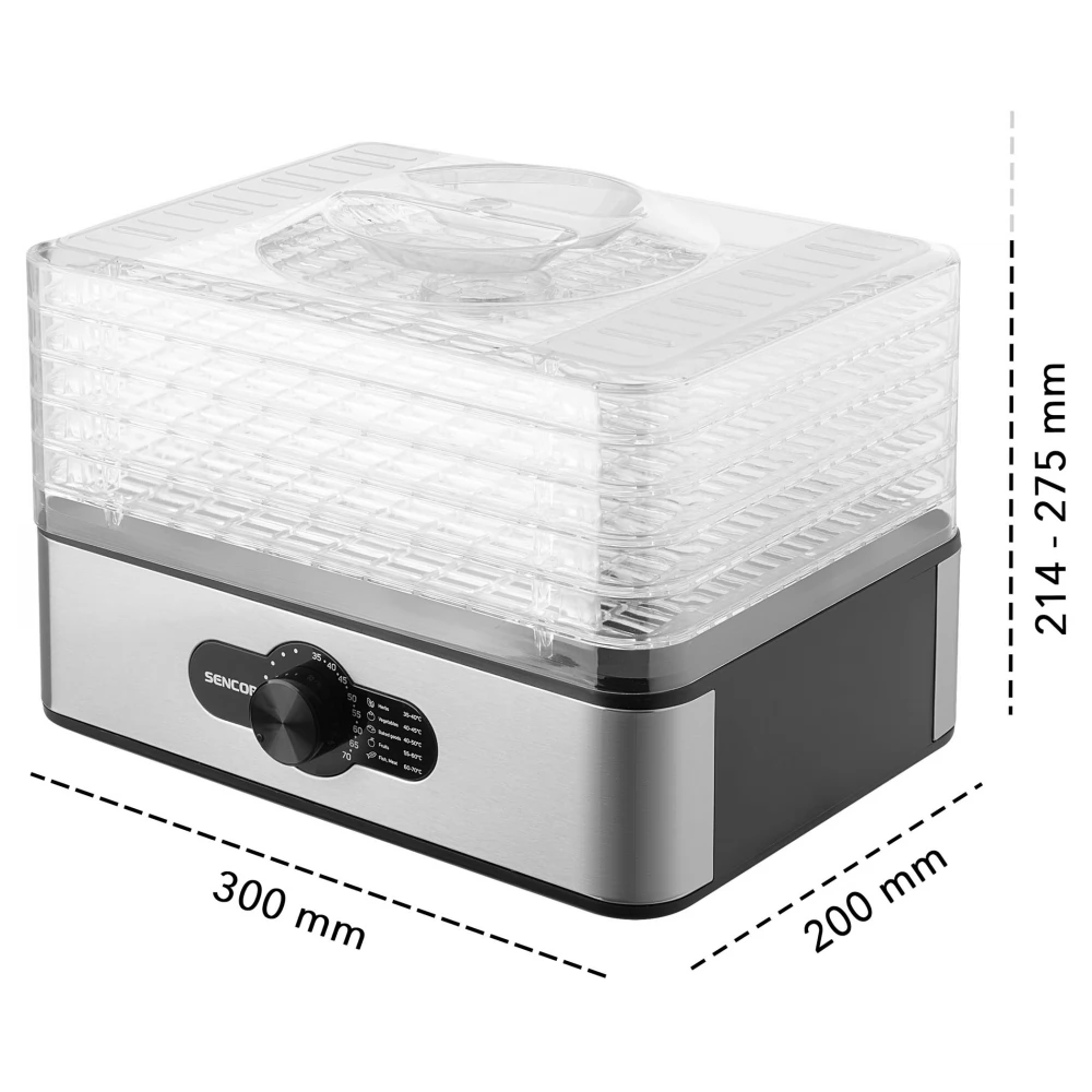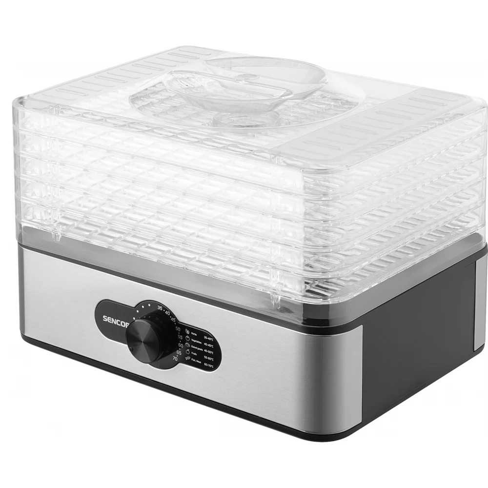 Uscătorul Sencor SFD 950SS are 5 tăvi de uscare. Tavile masoara 29 x 20 cm iar nivelurile de uscare pot fi reglate manual (16 sau 29 mm). Poate fi folosit pentru a usca diverse fructe uscate, ierburi, ciuperci, carne sau chiar peste. Ventilatorul incorporat asigura uscare uniforma pe fiecare nivel, iar designul grilajului ecranelor de uscare previne formarea mucegaiului si optimizeaza fluxul de aer. Capacul transparent permite monitorizarea completă a procesului de uscare.
