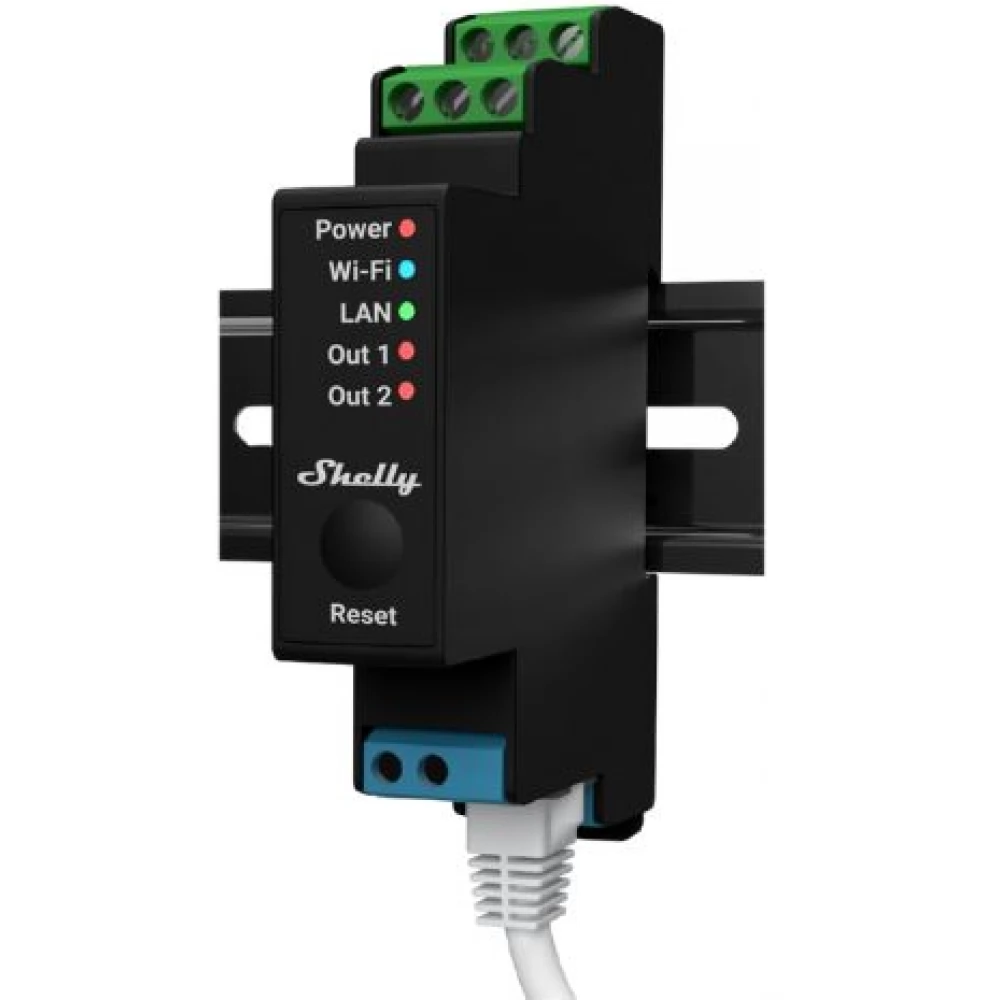 Releul profesional cu 2 circuite de la Shelly poate comunica prin Wi-Fi, rețea cablată (LAN) și conexiune Bluetooth și este o soluție potrivită atât pentru automatizarea locuințelor apartamentelor, cât și pentru automatizarea profesională a clădirilor comerciale mai serioase (magazine, condominii, magazine etc. .).