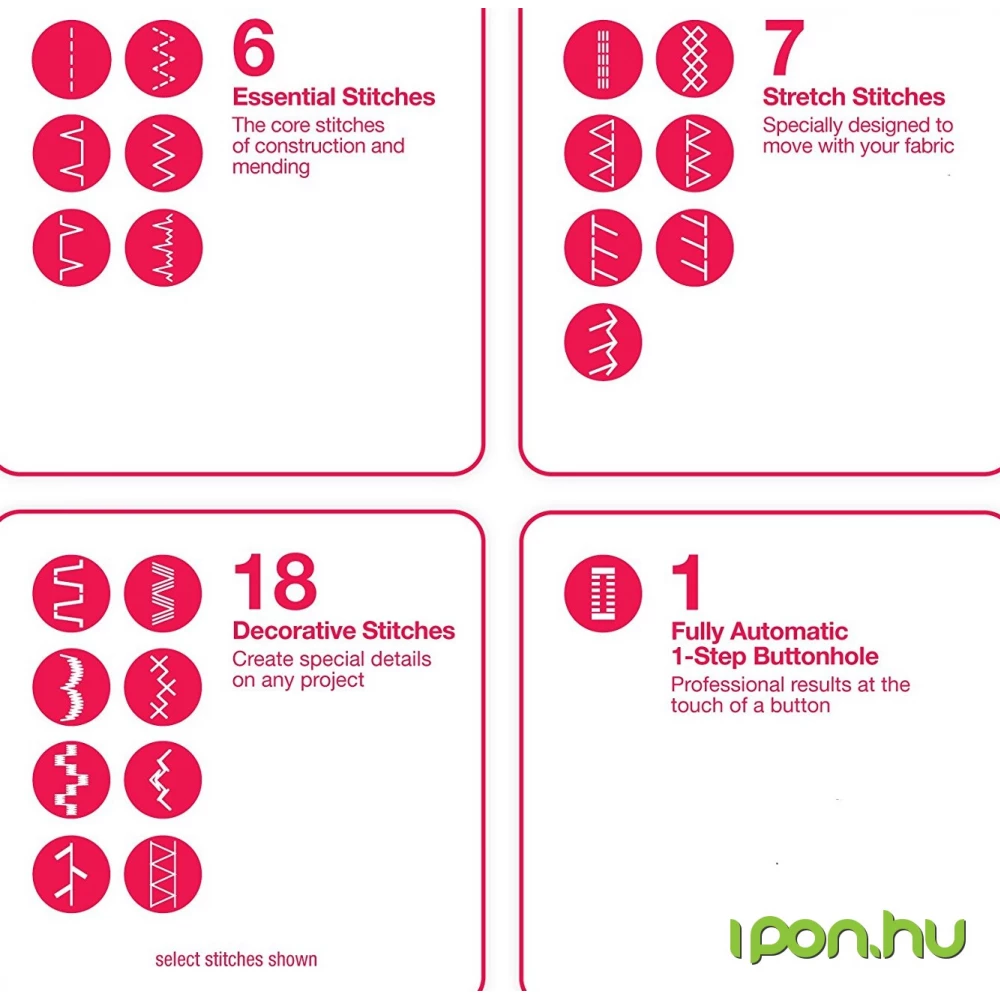 - 6 ochiuri de bază, 7 ochiuri elastice, 18 ochiuri decorative, 1 butoniera automată