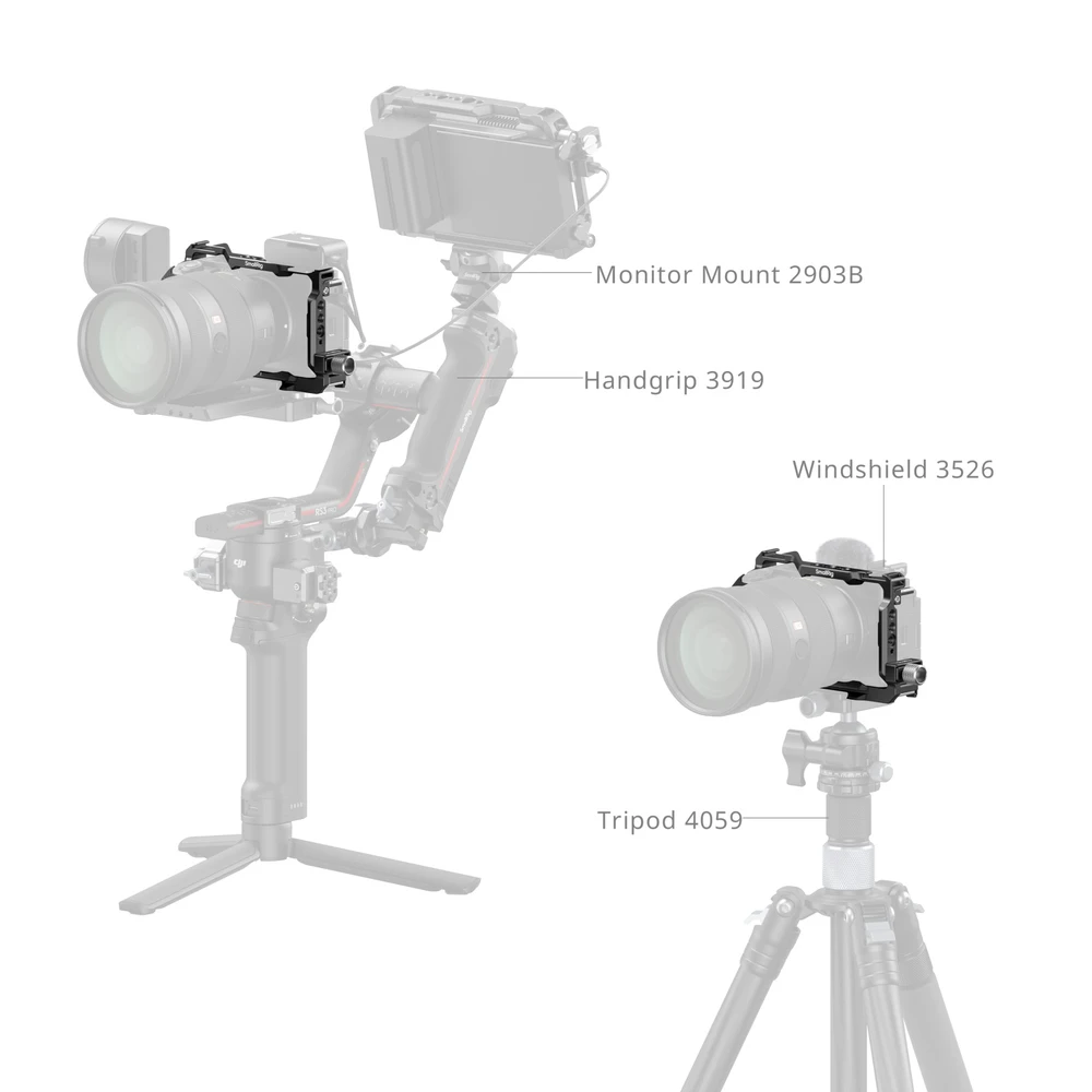 Cadrul oferă opțiuni extinse de extindere, inclusiv mai multe găuri filetate de 1/4"-20 și găuri de montare ARRI 3/8"-16 pentru a atașa accesorii precum mânerele superioare (ID 3765) sau mânerele laterale (ID 2913) pentru a îmbunătăți stabilitatea pentru fotografierea cu mâna. Orificiul superior de montare ARRI cu suporturi compatibile pentru monitor (ID 2903B) facilitează montarea monitorului. Suporturile duble cu pantof cald vă permit să atașați microfoane (compatibile cu DJI MIC 2), lumini și alte accesorii, în timp ce mufa QD de jos acceptă atașarea curelelor de umăr QD. În plus, deschiderile pentru curele de pe ambele părți și din partea inferioară sunt potrivite pentru atașarea curelelor de încheietură (ID 3848) și a curelelor de umăr (ID 5208).