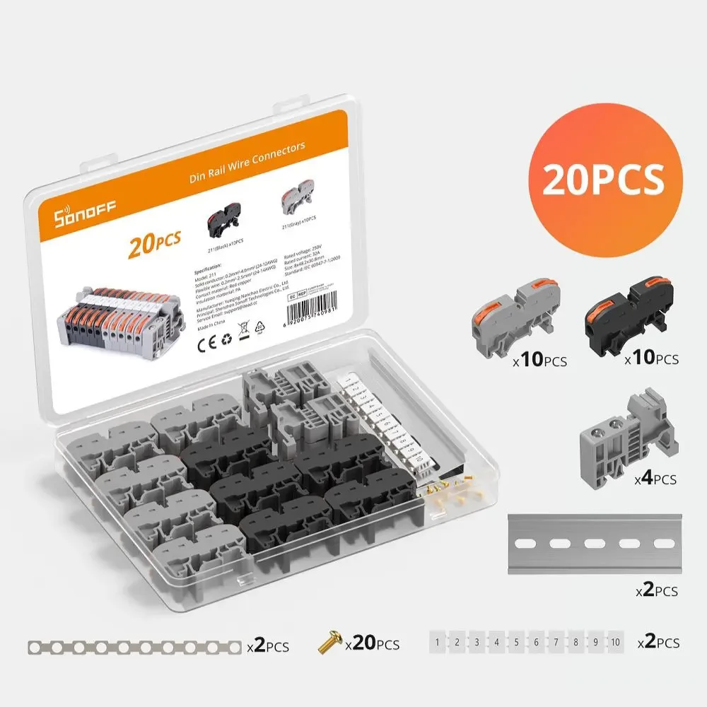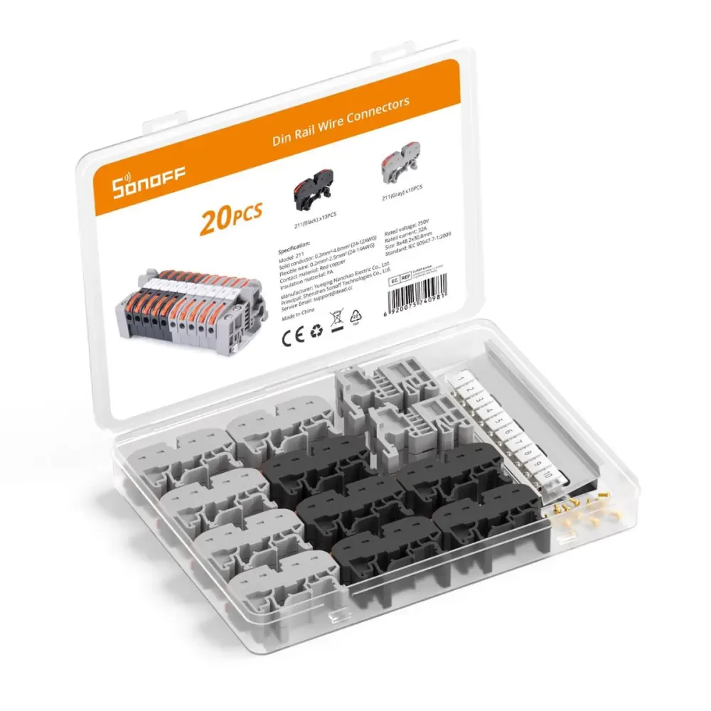 Conectorii de fire din șină DIN Sonoff ajută la conectarea firelor în dulapul electric într-un mod stabil, simplu și sigur și permit cablarea transparentă și sigură. Poate fi folosit și pentru a conecta fire de cupru solide, răsucite sau moi. Compatibil cu fire de 0,2-4 mm² (AWG 28-12), max. De asemenea, suportă un curent nominal de 32A.