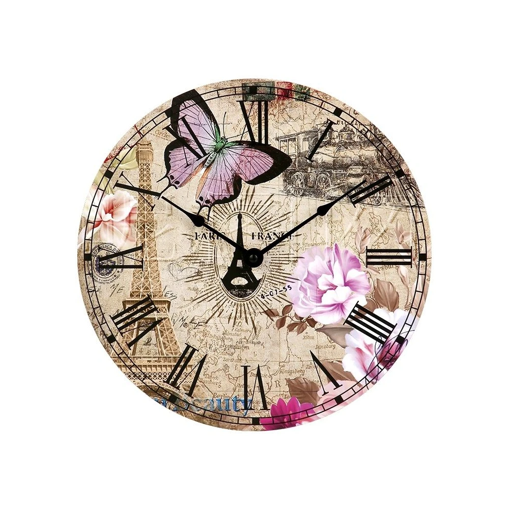 Cadranul maro deschis al ceasului de perete CL-5625 este decorat cu modele speciale - inclusiv un fluture, Turnul Eiffel, tren cu aburi, floare si frunza de copac - care confera un aspect unic, decorativ,...