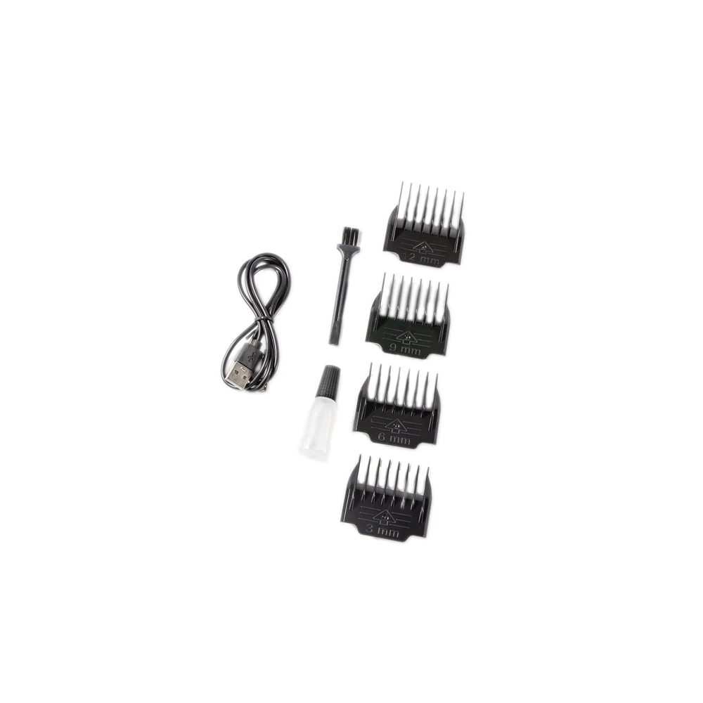 - Accesorii: piepteni limitatori de 3mm, 6mm, 9mm, 12mm (pentru reglarea lungimii parului), adaptor, perie de curatare