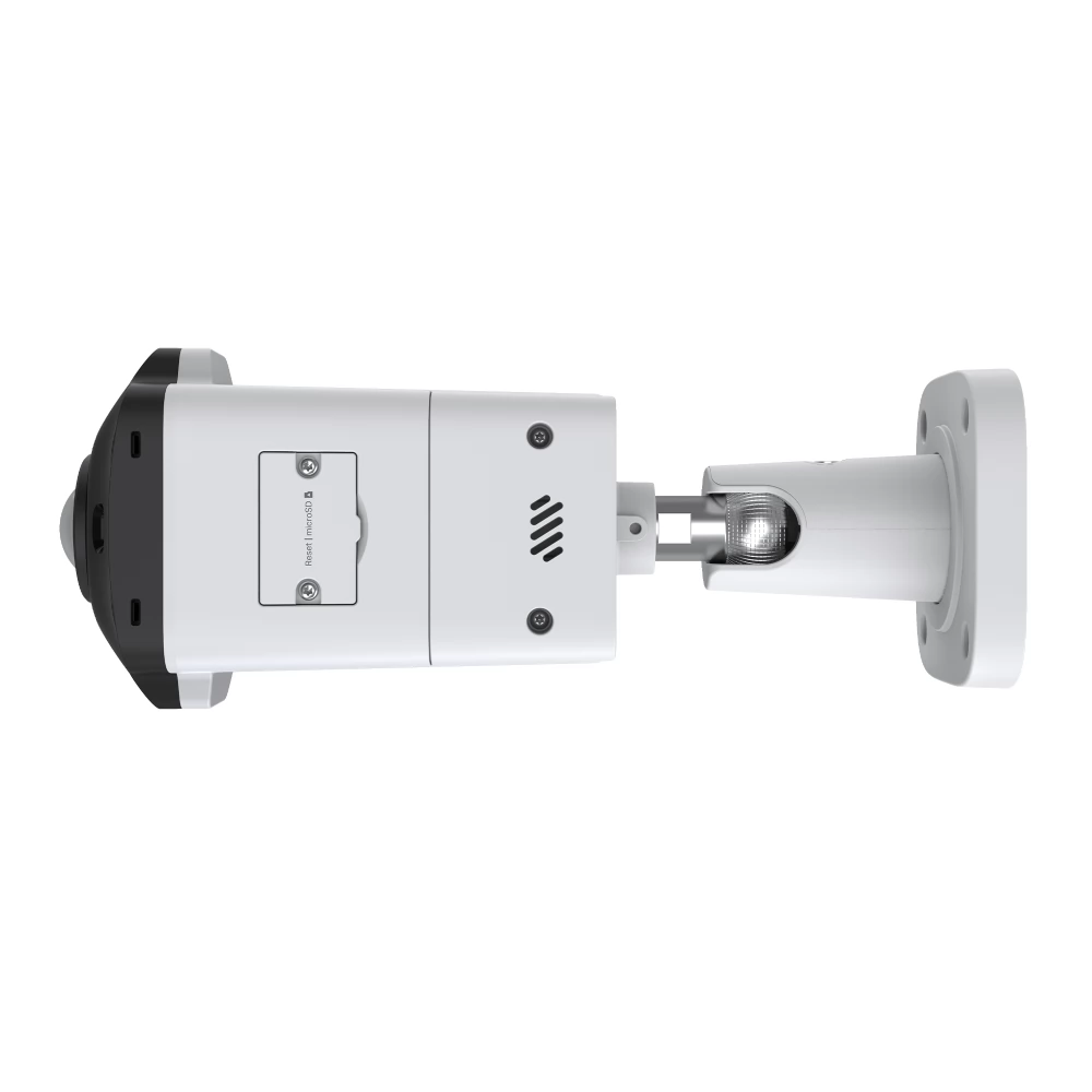 Cameră de panoramă de siguranță 4K UHD în aer liber cu o optică pentru ochi de pește de 1,65 mm.