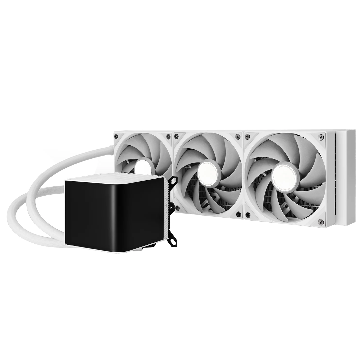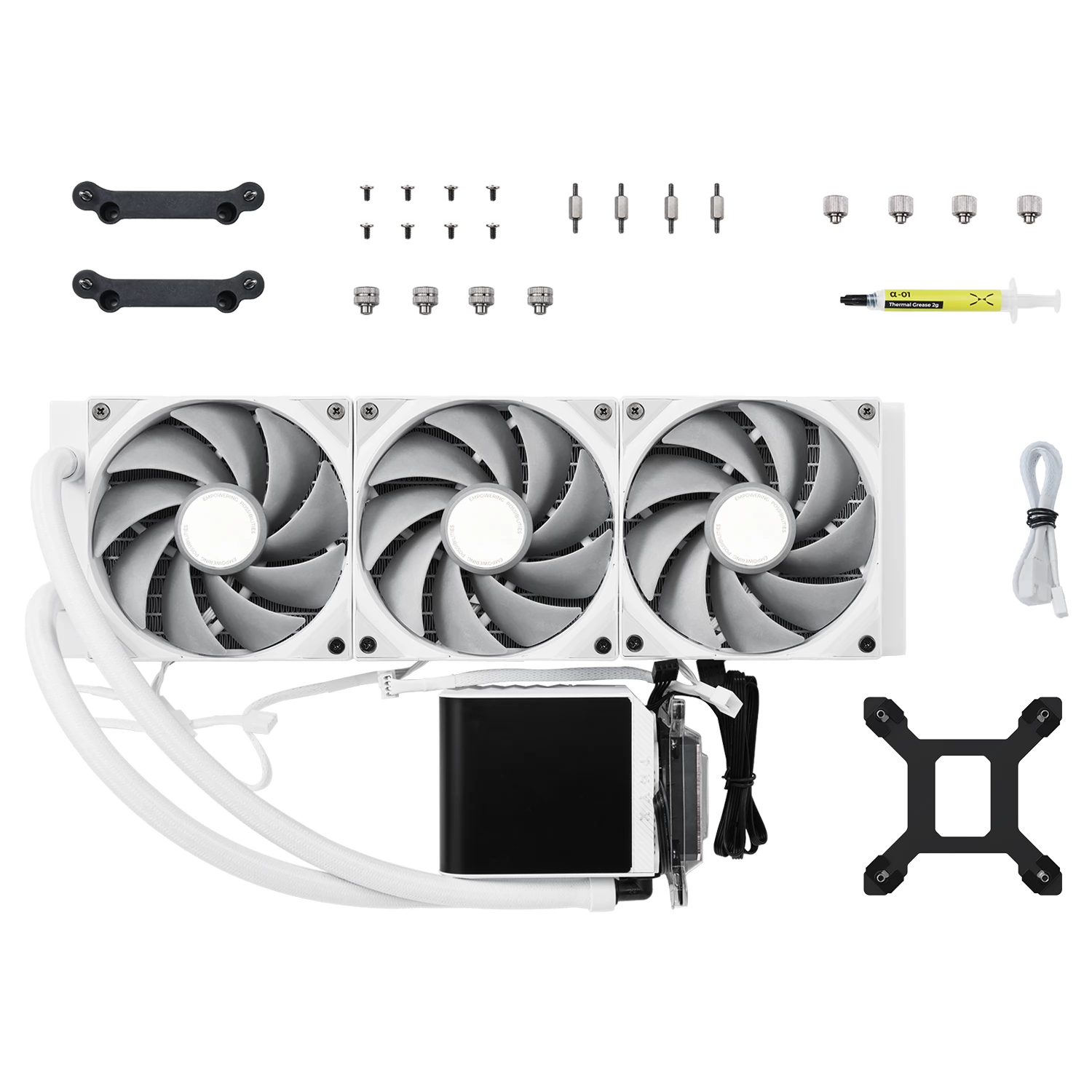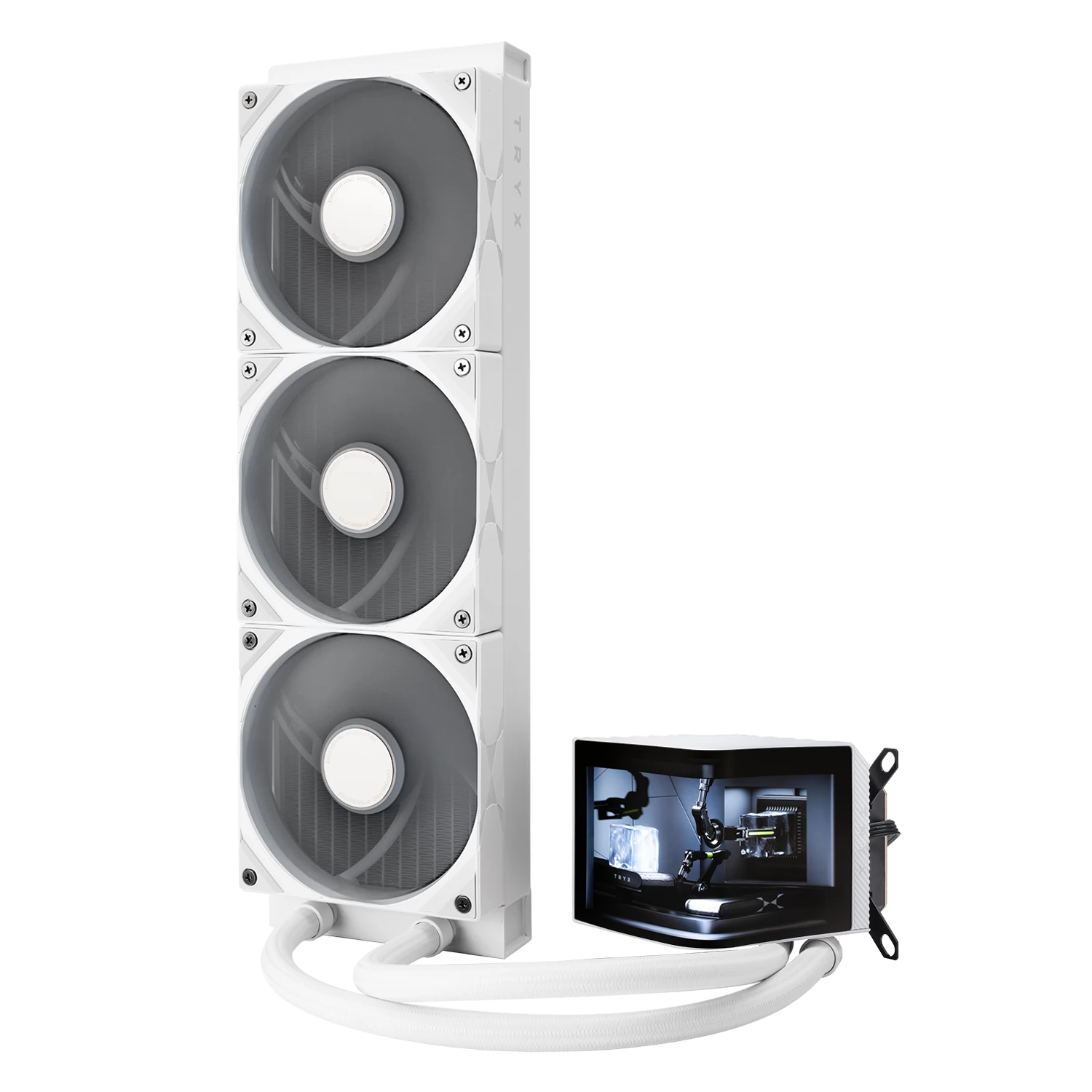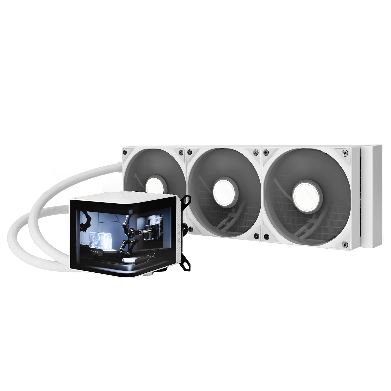 Răcire compactă, universală, cu 3 ventilatoare controlate de PWM de 120 mm, radiator de 360 mm și un afișaj AMOLED în formă de L cu blocuri de frigider CPU.