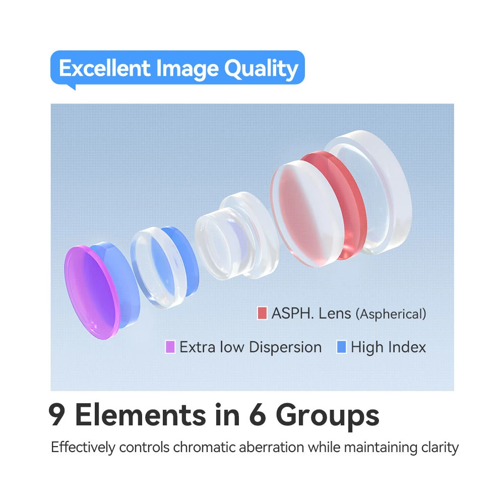 - Un asferic, un spray mai scăzut și două lentile de indice de refracție mari se urmăresc pentru a reduce aberația cromatică și a păstra puritatea imaginii